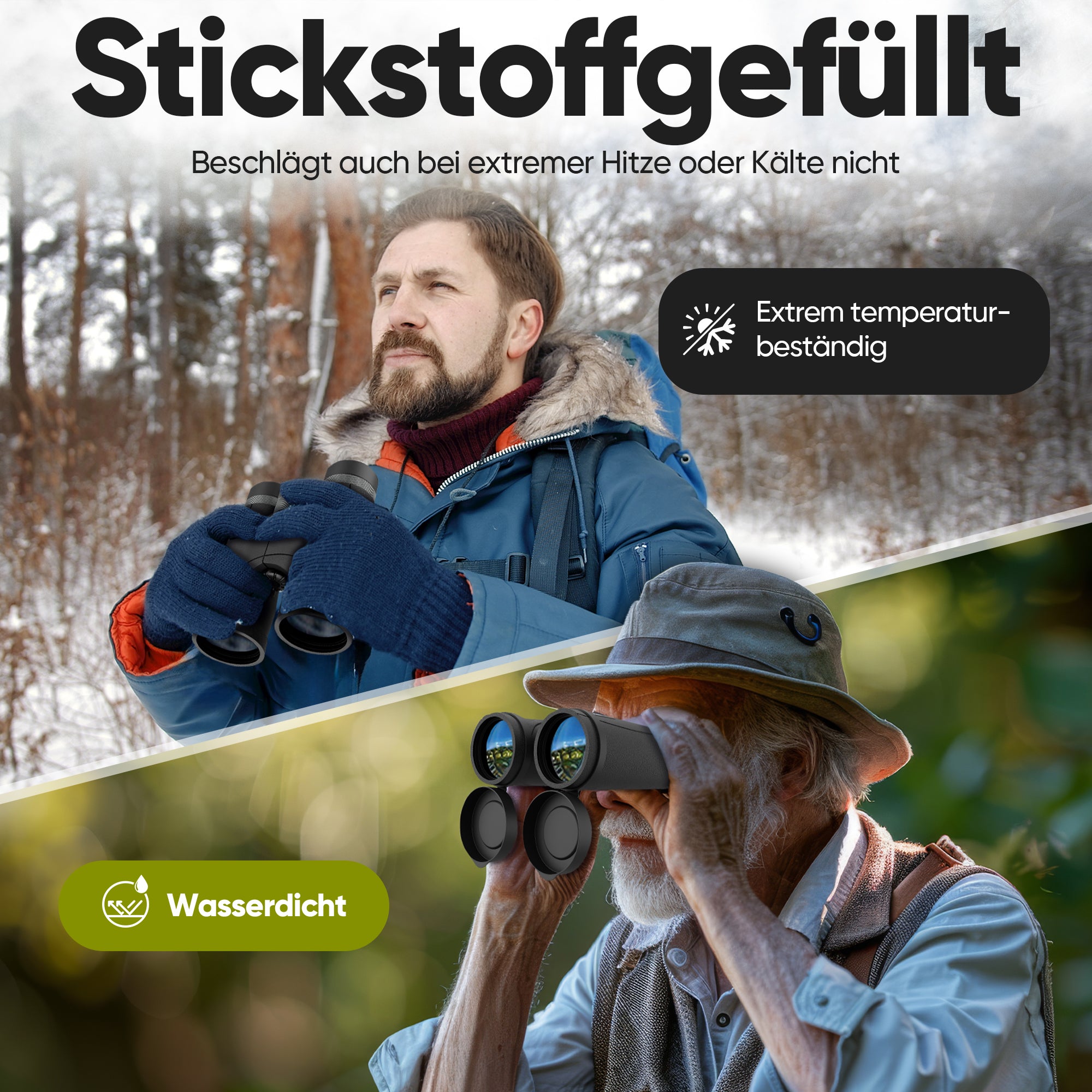 Das Fernglas ist wasserdicht und temperaturbeständig von -40°C bis +50°C. Es eignet sich perfekt für den Einsatz bei Regen, Schnee oder großer Hitze.