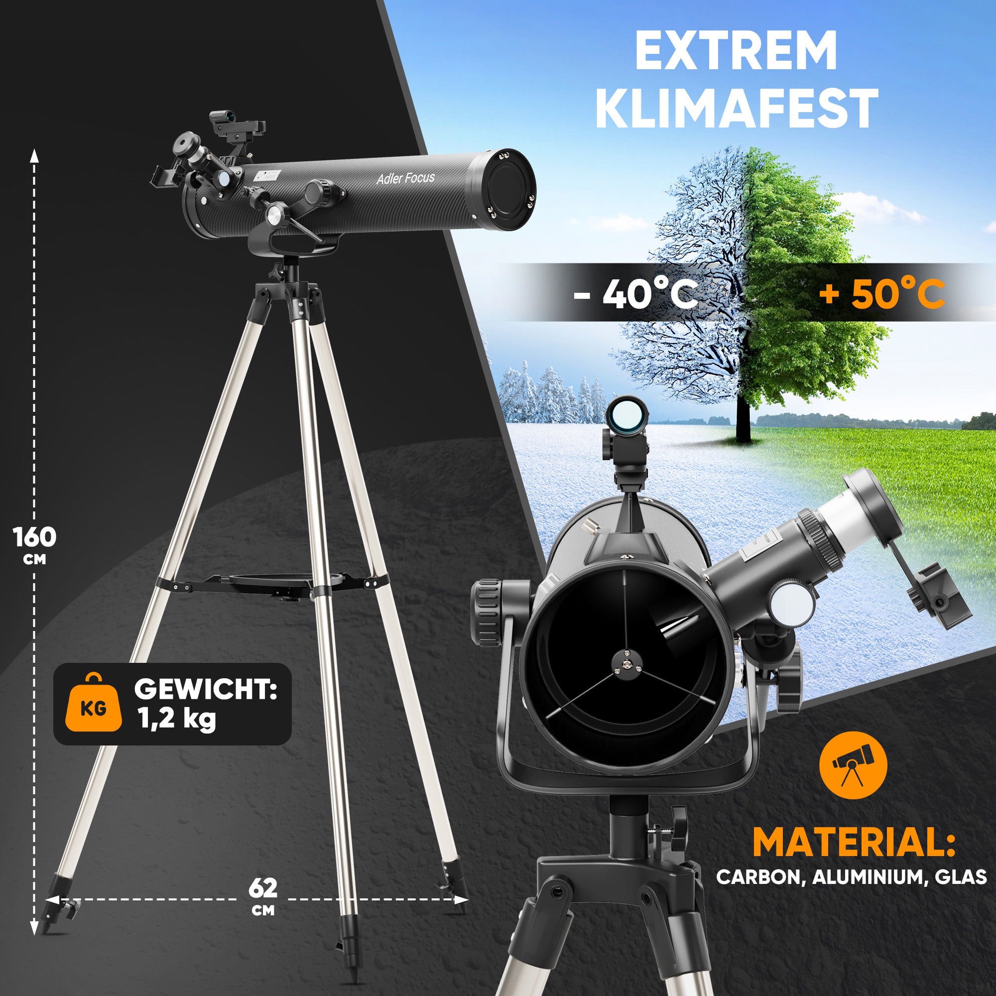 Mit einer Temperaturbeständigkeit von -40°C bis +50°C und einem leichten, robusten Design aus Carbon, Aluminium und Glas ist dieses Teleskop für alle Wetterbedingungen gerüstet. Egal ob bei eisiger Kälte oder sommerlicher Hitze – deine Himmelsbeobachtung bleibt stabil und klar.Mit seinem extrem robusten Design ist dieses Teleskop auf jede Herausforderung vorbereitet. Die Kombination aus hochwertigen Materialien wie Carbon, Aluminium und Glas sorgt nicht nur für eine beeindruckende Stabilität, sondern auch für ein leichtes Gewicht von nur 1,2 kg. Dank der Temperaturbeständigkeit von -40°C bis +50°C bist du bestens gerüstet, um den Nachthimmel zu jeder Jahreszeit zu erkunden – ob in eisiger Winterkälte oder unter der glühenden Sommersonne. Dieses Teleskop trotzt den Elementen, damit du den Blick in die Sterne jederzeit genießen kannst.