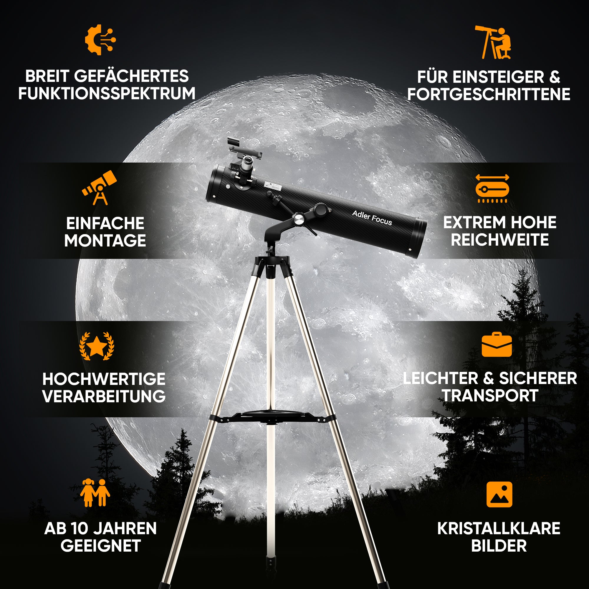 Mit dem Adler Focus Teleskop genießen Sie gestochen scharfe Details und eine beeindruckende Vergrößerung. Perfekt für die Beobachtung von Mond, Planeten und fernen Galaxien – robust, wetterbeständig und einfach zu bedienen. Ihr idealer Begleiter für unvergessliche Nächte unter dem Sternenhimmel!