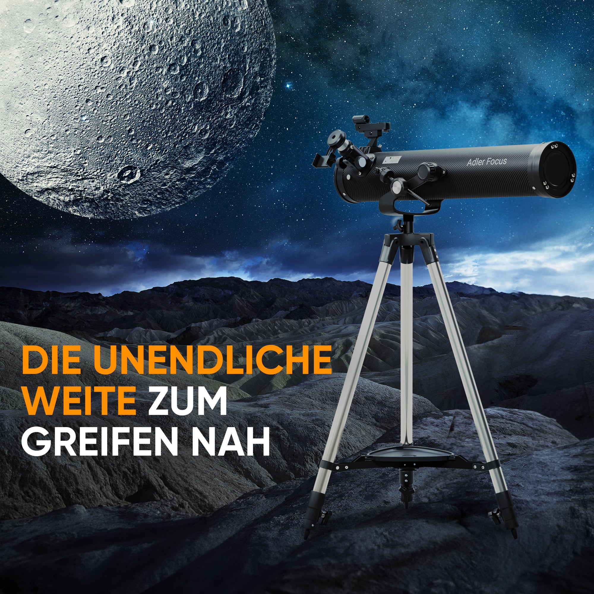 Tauche ein in die faszinierende Welt der Astronomie mit dem Adler Focus Teleskop. Diese innovative Neuentwicklung eröffnet dir dank bis zu 350-facher Vergrößerung atemberaubende Einblicke in den Nachthimmel – von detailreichen Mondkratern über die Planeten unseres Sonnensystems bis hin zu weit entfernten Galaxien.
